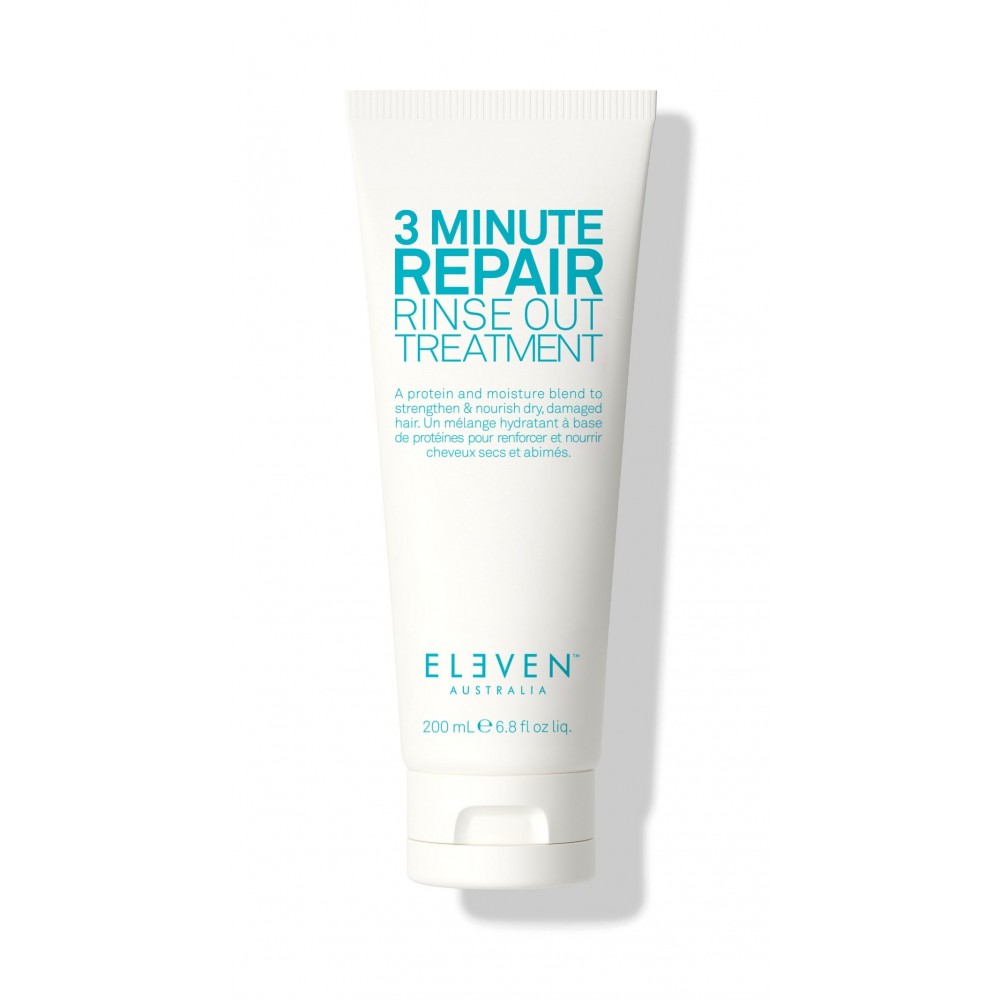 ELEVEN Australia „3 Minute Repair Rinse Out Treatment“ – tai intensyvi, greito poveikio plaukų kaukė, skirta sausiems ir pažeistiems plaukams atkurti bei sustiprinti. Vos per tris minutes ši priemonė efektyviai pamaitina plaukus, suteikia jiems glotnumo, elastingumo ir sveiko žvilgesio. Formulėje esantys taukmedžio sviestas, agurkų ekstraktas bei hidrolizuoti kvinojos baltymai veikia sinergiškai: minkština, stiprina ir apsaugo plaukus nuo aplinkos veiksnių.